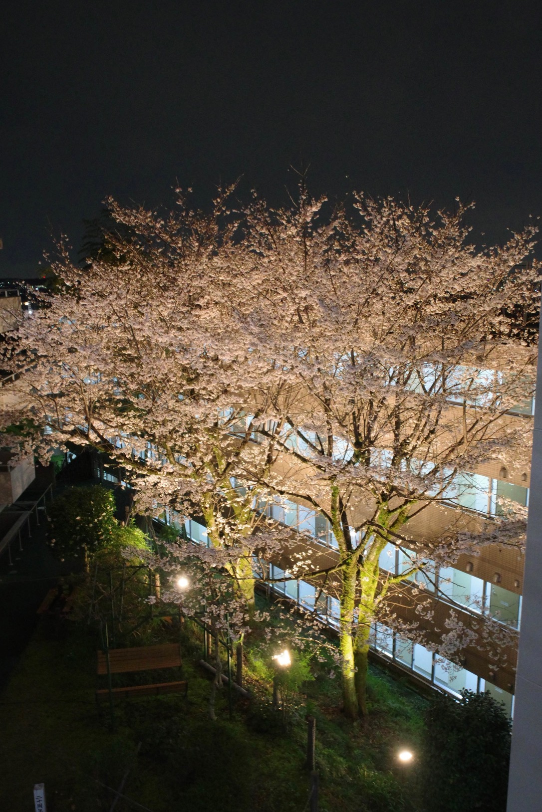 また、日が暮れてからは桜のライトアップを行っており、廊下や居室からも幻想的な夜桜をご覧いただけます。昼間とはまた違った雰囲気を楽しめると、ご入居者さまからも好評です。